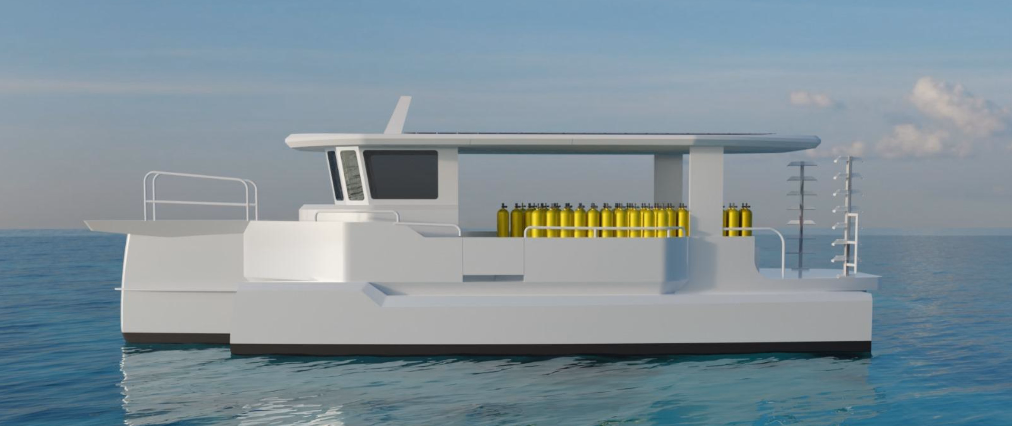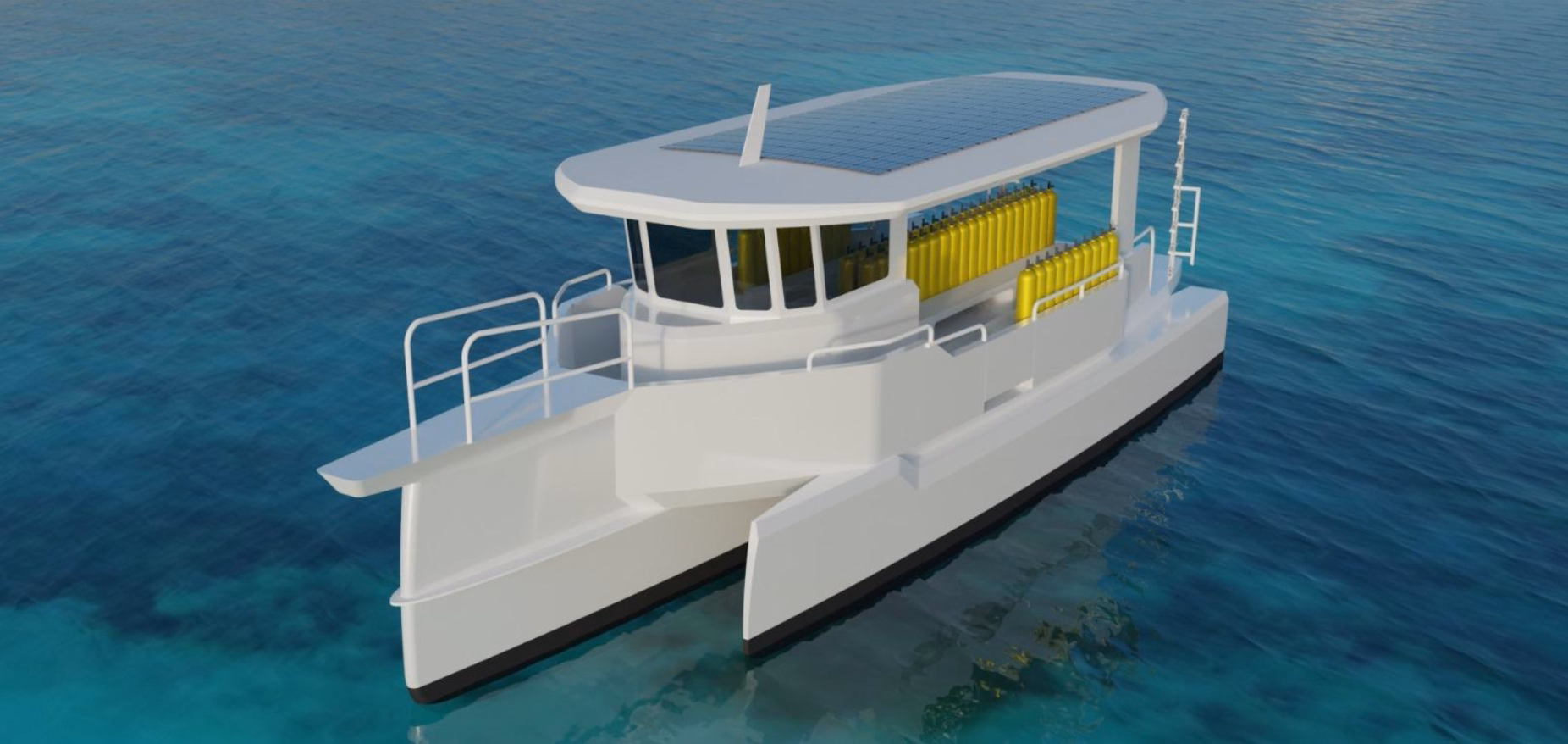 DENKI 1200 is an unsinkable electric aluminum trimaran for diving, offering exceptional stability and quiet, eco‑friendly trips for 12+ divers.